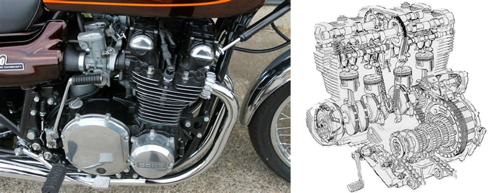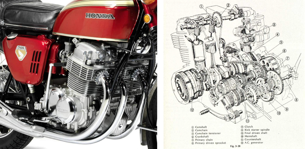 A korábbi brit és amerikai nagyvasakkal szemben ez a kompakt, keresztben beépített sornégyes blokk új szabványt állított fel: 736 cm³, SOHC-vezérlés, 67 LE 8000 f/perc fordulaton – és mindez gyártható, karbantartható, és szinte rezgés (vibráció)-mentes felhasználói élményt adva.