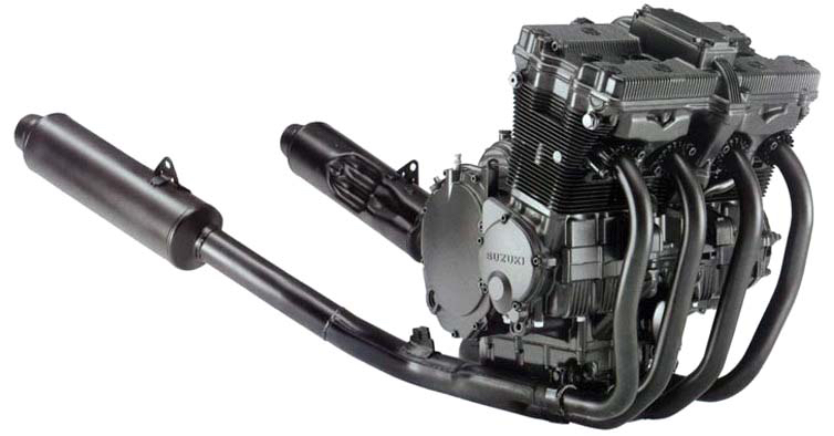 A GSX-R750 blokkja kompakt, könnyű és feszes egység volt. A motor 100–106 lóerőt adott le 10 500 fordulat/perc környékén, miközben mindössze 60 kilogrammot nyomott – ez drasztikusan kedvező fajlagos teljesítmény–tömeg arányt eredményezett. A hengerfej szűk szelepállású, 33°-os szelepszöggel készült, a két vezérműtengely közvetlenül, himbák nélkül működtette a szelepeket. A 16 szelepes elrendezés javította az áramlási hatásfokot és a töltetcsere-dinamikát, így a motor akár 12 000 fordulat/percig is biztonsággal pörgött – ez közúti motorban addig szinte ismeretlen volt.