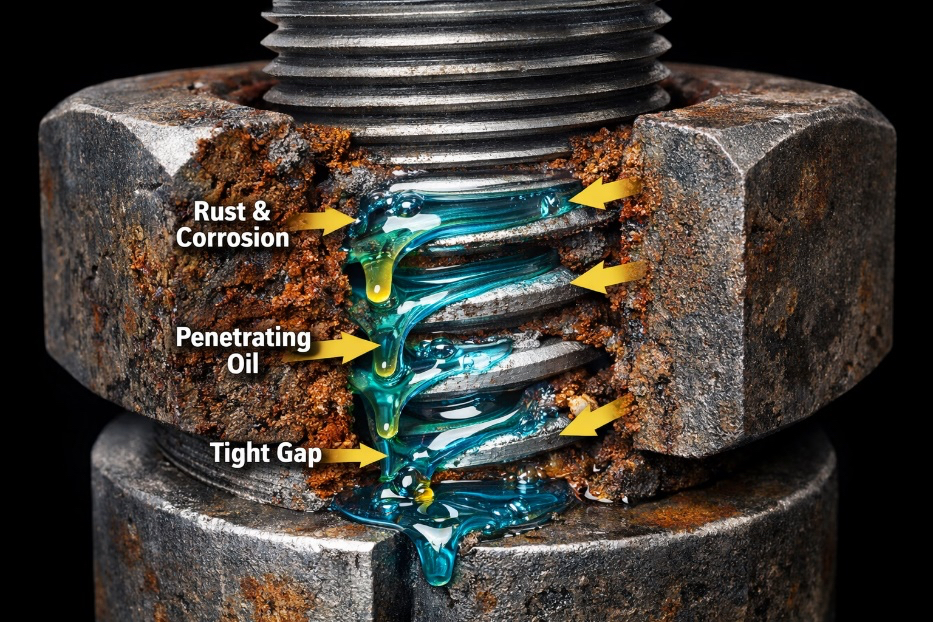Ebben a komplex állapotban lépnek be a penetrációs kenőanyagok, amelyek működését nem kenéstechnikai, hanem elsősorban felületfizikai szempontból kell értelmezni. A penetrációs olaj elsődleges feladata nem a klasszikus értelemben vett kenés, hanem a kötésben kialakult mikroszerkezet fellazítása. Ennek alapfeltétele az alacsony dinamikai viszkozitás és az alacsony felületi feszültség, amelyek lehetővé teszik, hogy az anyag a kapilláris hatás révén behatoljon olyan résekbe is, amelyek mechanikai úton már nem hozzáférhetőek. A korszerű csavarlazítók oldószerkomponensei részben feloldják, részben fellazítják a korróziót, miközben a hordozóolaj fokozatosan mélyebbre szivárog a menetek közé. Az EP (Extreme Pressure – extrém nyomásálló) - adalékok ebben a fázisban nem klasszikus kenőfilmet képeznek, hanem határkenési állapotot hoznak létre, amely csökkenti a fémes érintkezések súrlódását és megakadályozza az újabb hideghegedési pontok kialakulását.
